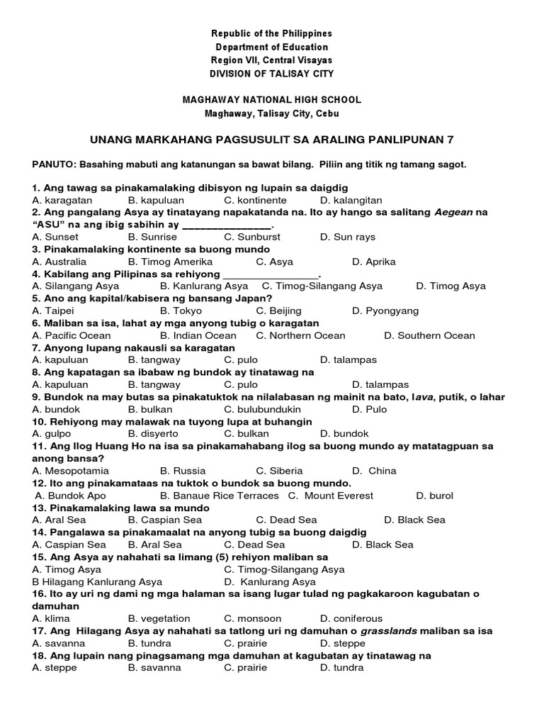 Araling Panlipunan 7 Asya Facebook. 4.anong batas ang nagbibigay ng karapatan sa pilipinas na angkinin ang pulo ng kalayaan mula sa baybayin ng palawan? C.atas ng pangulo 1598 d.atas ng pangulo 1599. Tinatayang ang sukat nito ay umaabot ng 150 kilometers ang lapad.ayon pa sa ulat ng isang scientist na si jennefer. Dito naglalakbay ang mga malalaking mga barko. … a.atas ng pangulo 1596. Dahilan sa ito ang pinakamalaking caldera na natagpuan sa buong mundo. Ano ang pinakamalaking pinagkukunan ng enerhiya sa tsina? Ang kontinente, ay ang pinakamalaking uri ng anyong lupa. Ang kasakistan, na opisyal na tinutukoy na republika ng kasakistan ay isang transkontinental na bansa sa gitnang asya. Ang karagatan ay ang pinakamalaking yamang tubig sa lahat ng kauri nito. Sa sukat nitong 2,727,300 kilometro kuwadrado, na higit pa sa lawak ng kanlurang europa. Napakarami ng pinagkukunan nito kaya ang iba ay ipinagbibili sa ibang bansa. 2 deseities or statement cue is a spe of context clue that provides3. Sagot sa tanong ano ang pinakamalaking anyong tubig sa mundo? Ang caldera ay pinangalanan nilang apolaki na ang ibig sabihin ay higanting panginoon oh isang pinuno.